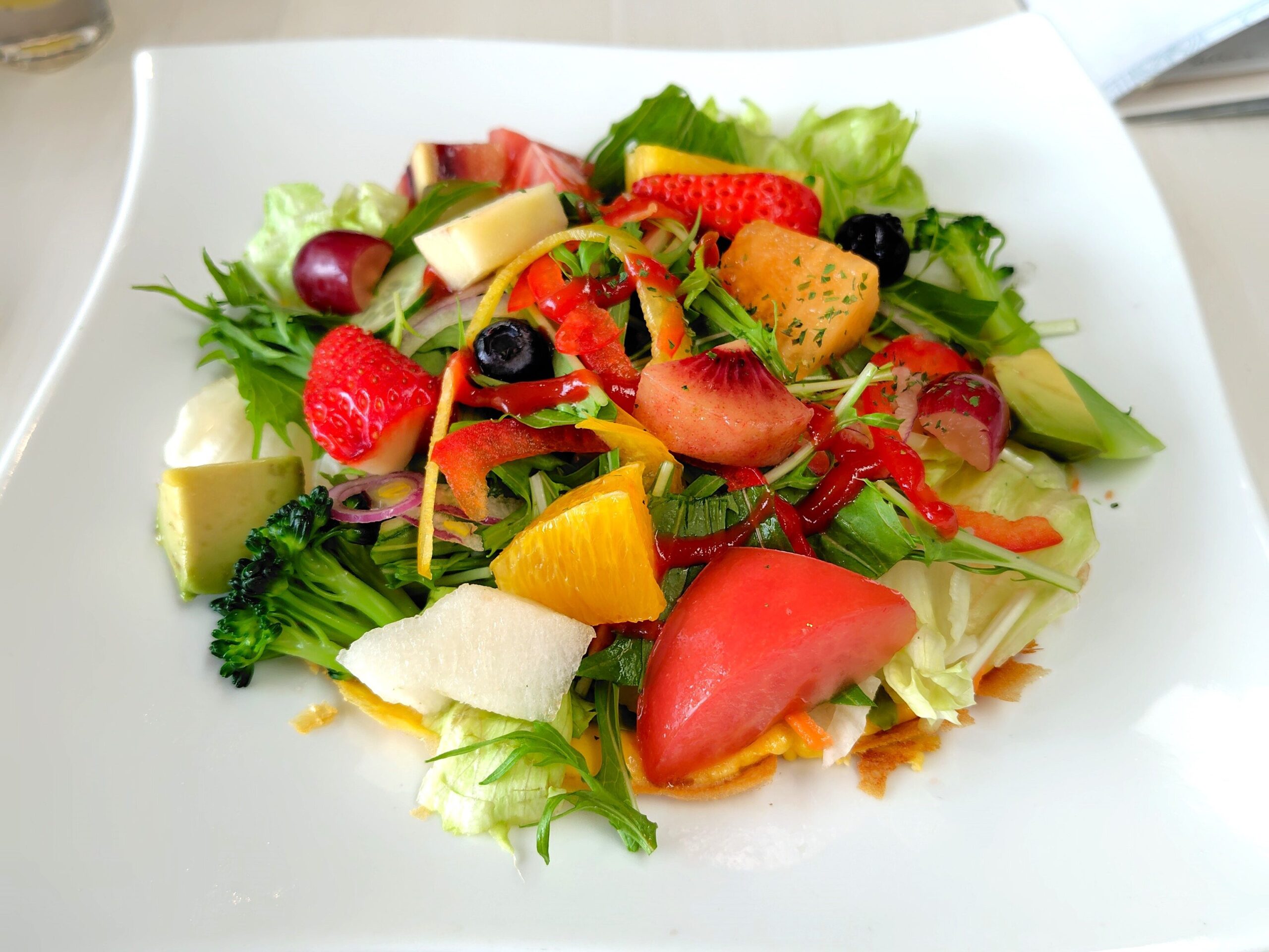 サラダ、フルーツ、オムライスを全部一緒にスプーンですくって食べると、野菜のシャキシャキ感、果物の甘酸っぱさ、ふわふわの卵が合わさり、素材そのままの味わいと様々な食感を一度に楽しめます。